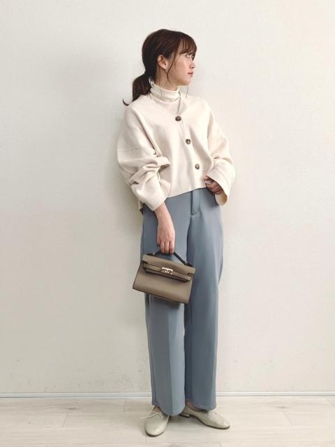短めの袖丈が今っぽいホワイトのカーディガンもユニクロのアイテム。ゆるっとリラックスして着られる大きめシルエットがポイントです!