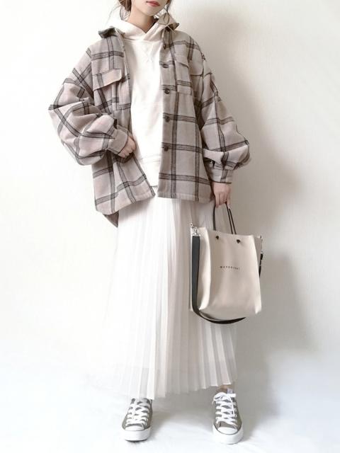 清潔感バッチリのホワイトのプリーツスカートは、フェミニンなスタイルにぴったり。パーカーと合わせてカジュアルダウンさせてもGood!