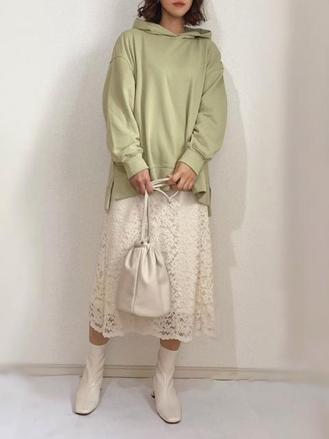 ホワイトのフェミニンなレーススカートには、くすみグリーンのカジュアルなパーカーがぴったり!甘さ×爽やかさのキレイめカジュアルなコーデにまとまり、親しみやすさも出せますよ。