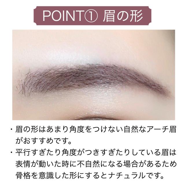 近頃は自眉の形をあまり大きく変えない自然な眉がトレンドのため、眉の形はあまり角度をつけない自然なアーチ眉がおすすめです。