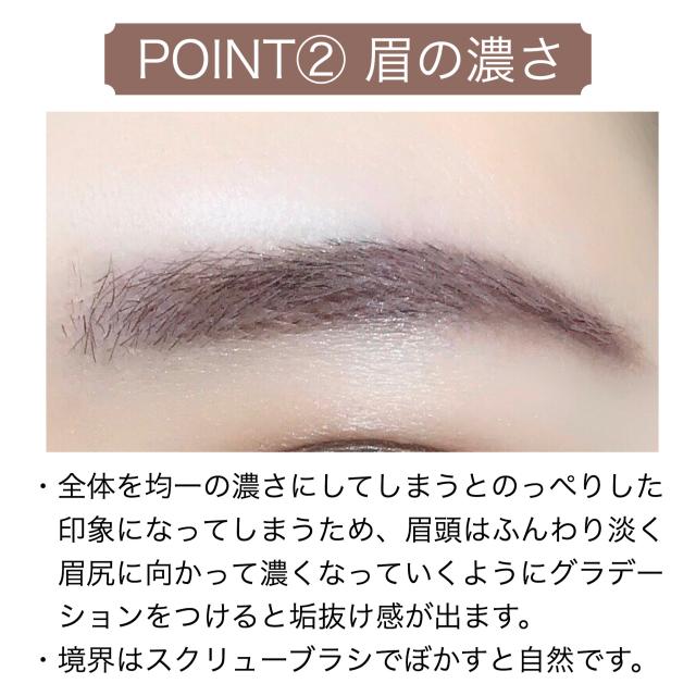 くっきりと描きすぎた眉はトレンド感のない印象になってしまうため、スクリューブラシ等でぼかすと仕上がりが良くなります。