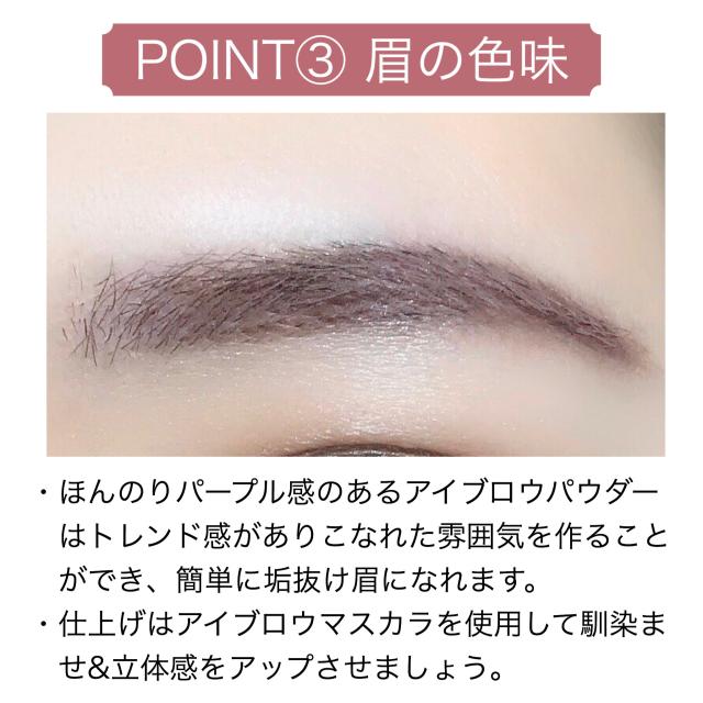 基本的には髪色に合ったアイブロウアイテムを使う方が多いかと思いますが、ほんのりパープル感のあるアイブロウパウダーを取り入れることで、トレンド感をプラスしてこなれた雰囲気を作ることができます。