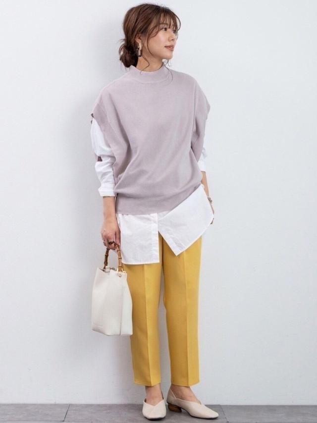 パープルとイエロー以外のアイテムをホワイトや肌なじみの良いベージュでまとめることで、春色をMIXさせてもすっきりとした着こなしに仕上がります。