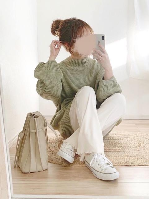 グリーンのニットにホワイトパンツを合わせたコーデ。春らしさ満点の洗練されたおしゃれな着こなしに仕上がっています。