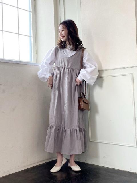 くすんだグレーのようなミントカラーのワンピースにふんわりとした白ブラウスを合わせて、フェミニンに仕上げています。デートにもぴったり♡