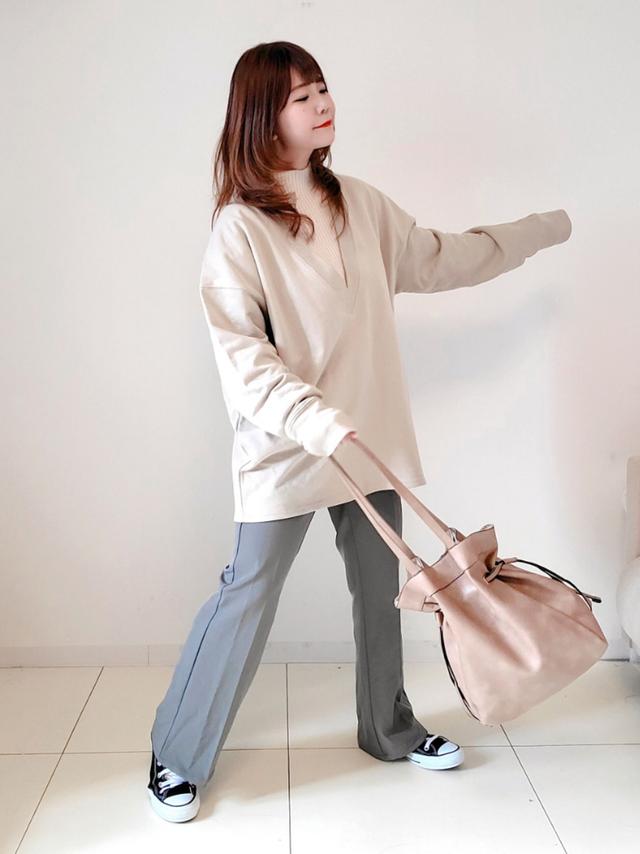 春色アイテムは、ホワイトやベージュなど明るめカラーと合わせるとより爽やかな雰囲気に仕上がりますよ。