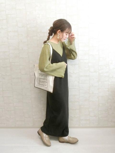 黒のキャミワンピースにグリーンのブラウスを合わせてシンプルに。まだ肌寒い今の時期には、ゆるカーディガンを羽織って女性らしく仕上げてもいいですね♡