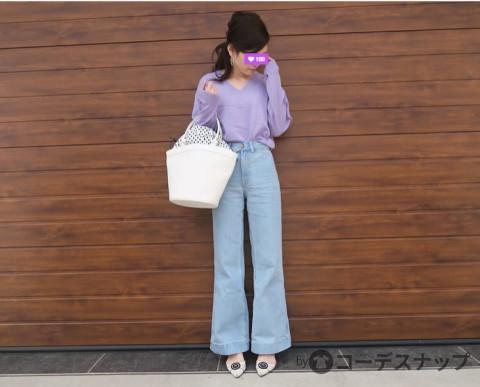柔らかなラベンダーカラーが女性らしい春スタイル。上品できれいめな雰囲気のあるカジュアルコーデですね。