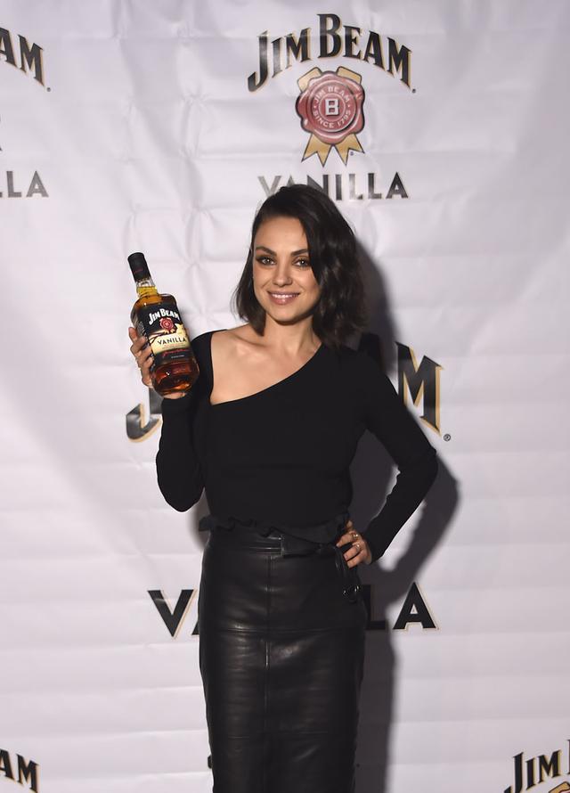 Here’s Mila Kunis looking like one of the hottest celebrity babes/moms on the entire freaking planet and busting out her huge new mom bosom like a boss, woohoo! Wow, she looks hotter than ever, eh? And totally bustier than ever too! And she’s holding a bottle of bourbon to boot, so yeah, she’s clearly after my heart. Cheers!