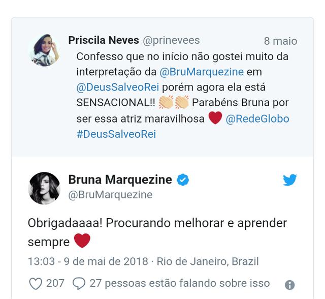 No ar como a vilã Catarina em "Deus Salve o Rei", Bruna Marquezine foi elogiada por uma fã no Twitter, nesta quarta-feira (9). No microblog, uma seguidora comentou a atuação da atriz na trama das sete. "Confesso que no início não gostei muito da interpretação, porém agora ela está sensacional! Parabéns por ser essa atriz maravilhosa", escreveu. Preocupada em aprimorar seu trabalho, a atriz respondeu: "Obrigada! Procurando melhorar e aprender sempre". Recentemente, José Fidalgo, par romântico de Bruna no folhetim, a defendeu de críticas. "O que ela está dando para essa novela é algo difícil de as pessoas compreenderem. Como vilã, está sendo fenomenal", falou o português.