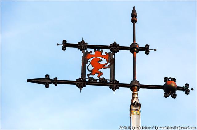 This lion can safely be called a record holder, because it is the highest of all (415 m above sea level). Its image is decorated with a weathervane, which is located on the Castle Hill.