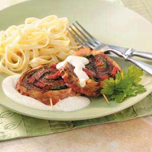 Meanwhile, cut steak horizontally from a long side to within 1/2 in. of opposite side. Open meat so it lies flat; cover with plastic wrap. Flatten to 1/4-in. thickness. Remove plastic. Place spinach over steak to within 1 in. of edges; top with red peppers.