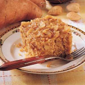 In a large bowl, beat oil and sugar. Add eggs, one at a time, beating well after each addition. Beat in the sweet potato, water and vanilla. Combine flour and cinnamon; gradually add to potato mixture until well blended. Stir in almonds.