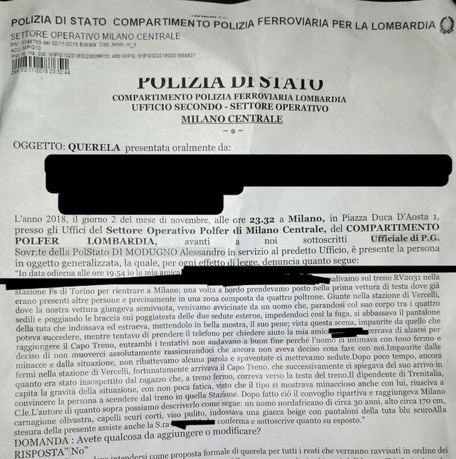 "Decidiamo di fare subito denuncia come consigliato dal capotreno appena scese a Milano, nonostante il mostro sia sceso a Vercelli dove non c'è la polizia ferroviaria e quindi in giro libero senza alcuna conseguenza. In Centrale mi sono sentita nuovamente violentata, questa volta dallo Stato, dato che nel 2018 hanno deciso di eliminare la legge contro l'esibizionismo pubblico e nonostante le minacce, questa denuncia è pressoché inutile", chiosa delusa la giovane che si augura che la sua denuncia possa sensibilizzare le istituzioni a migliorare la situazione di abbandono e degrado che quotidianamente i pendolari sono costretti a vivere sui treni.