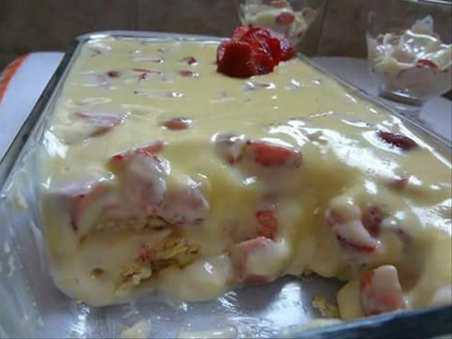 Num refratário, coloque na seguinte ordem: uma camada de bolacha (passe as bolachas no leite com açúcar rapidamente), uma camada de morangos picados, metade do creme. Repita as camadas terminando com o creme. Decore a seu gosto, com morangos e chantilly.