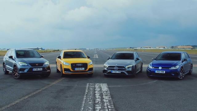 Честь горячих хетчбэков в этом дрэге защищали канонический Volkswagen Golf R и премиальный Mercedes-AMG A35, оба – с 2-литровым четырехцилиндровым турбомотором мощностью более 300 л. с. и массой примерно в 1500 кг. Со стороны кроссоверов выступили Audi SQ2 и Cupra Ateca с тем же двигателем, что у Golf R.