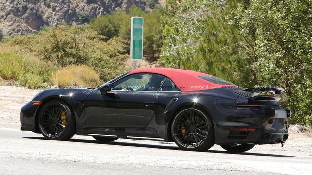 Кроме того, хорошо заметен массивный аэродинамический элемент в задней части кабриолета: судя по всему, Porsche 911 Turbo получит активное антикрыло, которое сможет подниматься и опускаться в зависимости от скорости движения.