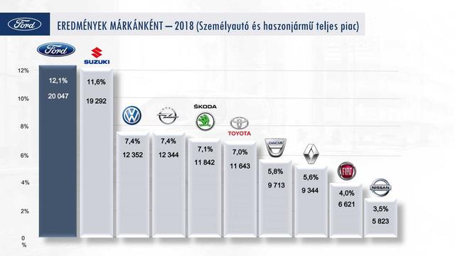 A 2018-as esztendőben az új személy- és kishaszongépjármű eladások közel 17% százalékkal növekedtek Magyarországon, és túlszárnyalták a 166 ezres össz. darabszámot*. A Ford 2018-ban 23,6 százalékos eladásnövekedésével húzta fel a piac eredményeit. A márka vezeti az összesített eladásokat összesen 20047 eladott személy- és haszongépjárművel. A személyautók piacán második helyezett lett a márka a Suzuki mögött (19 292 vs. 13 653), míg a harmadik helyen végző Skoda 11 842 járművet adott el itthon.