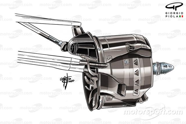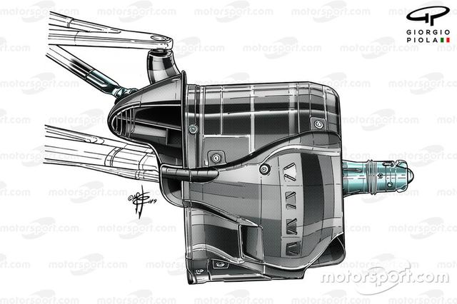 El objetivo de la protesta de Renault no es todo el coche –aunque todo el mundo ha sacado conclusiones de lo parecido que es al Mercedes 2019–, sino los conductos de freno (arriba a la izquierda), que son una parte listada en 2020. El diseño de Mercedes en 2019 es el dibujo de la derecha.