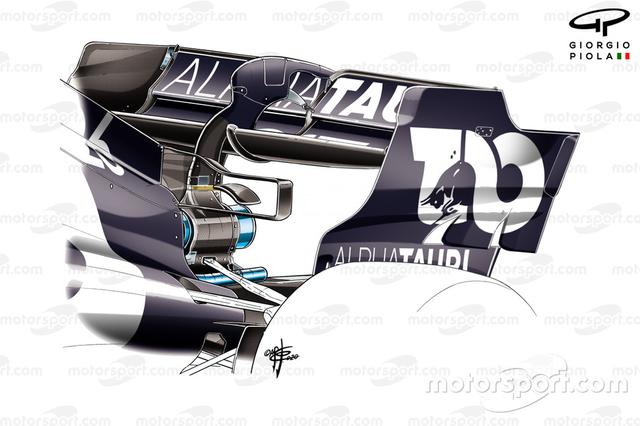 AlphaTauri continúa buscando pizcas de rendimiento en lugar de seguir tendencias de otros, y en la trasera del AT01 tienen un pilar de soporte del alerón trasero y un T-Wing.