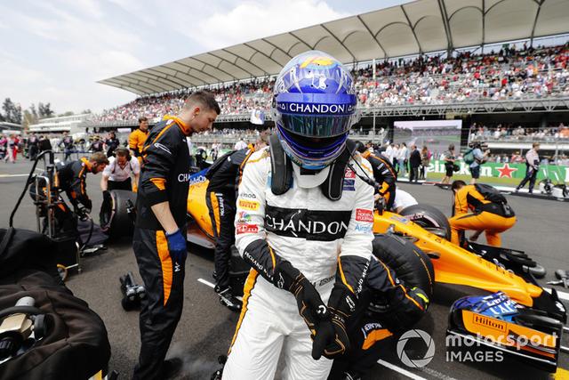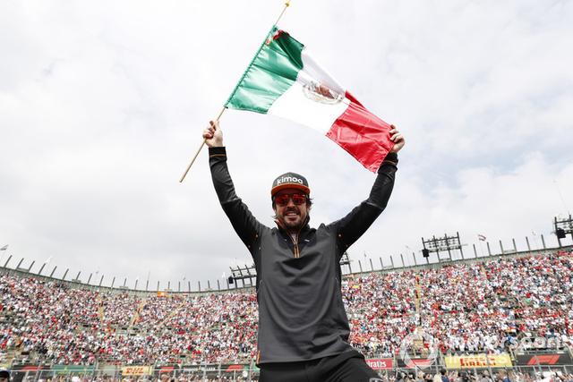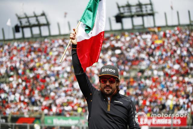 Fernando Alonso, McLaren, celebra con una bandera mexicana antes de la carrera