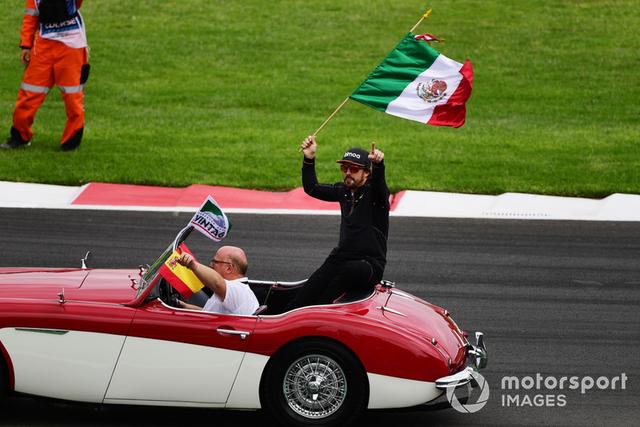 El bicampeón del mundo fue homenajeado durante el parade previo al inicio de la competencia. Durante el desfile recibió una fuerte ovación por parte de los aficionados en el Foro Sol, mientras que al llegar a la recta principal un grupo de oficiales presumía su máscara, motivo suficiente para que Alonso fuera con ellos y posara para unas fotos.