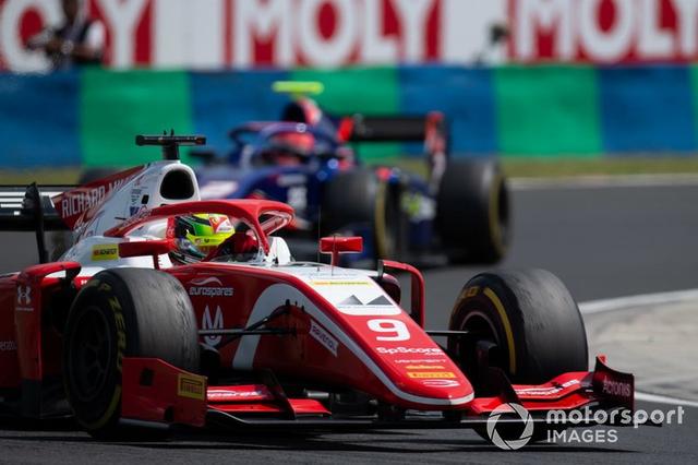 Prema Racing driver Schumacher fended off Carlin driver Nobuharu Matsushita to score his first win and podium in the series at the Hungaroring on Sunday.