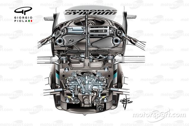 Como nossa fotografia exclusiva mostra, o conjunto de direção com que a equipe construiu o carro é uma solução como a usada pela Mercedes em 2019. Ao fazer isso, a Mercedes abandonou temporariamente a capacidade de ajuste do piloto que o sistema de direção de eixo duplo geralmente oferece.