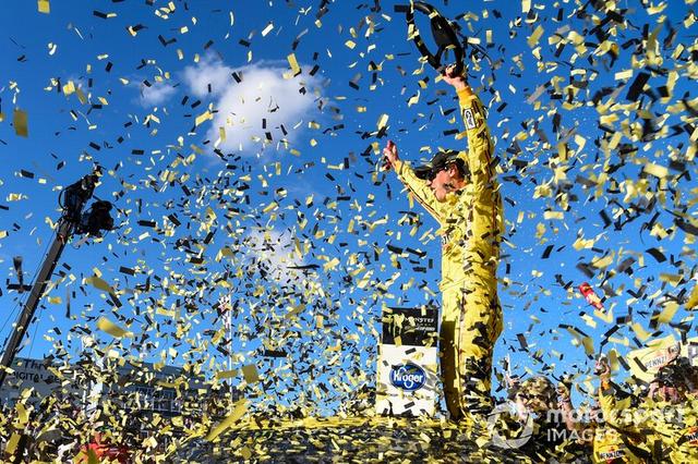 Joey Logano, Team Penske, Ford Mustang Pennzoil, celebrates victory lane after winning the Pennzoil 400.