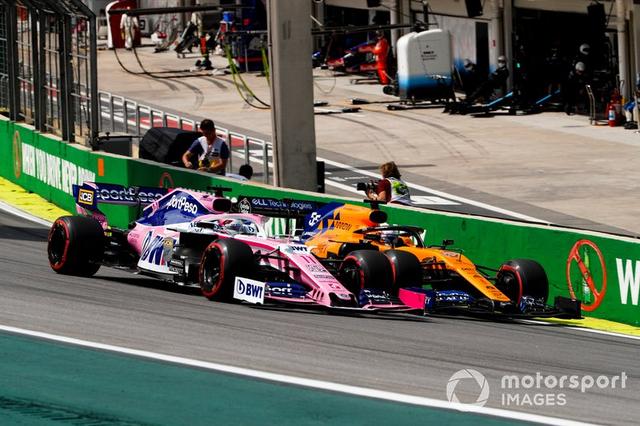 Sergio Perez, Racing Point RP19 and Carlos Sainz Jr., McLaren MCL34 battle