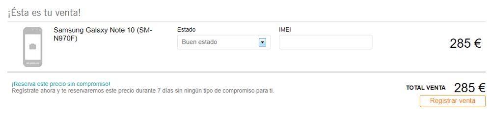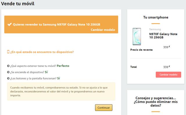 Otra de nuestras paradas obligadas en el servicio Removil de Phone House. La tienda online nos pagará un máximo de 285 euros por nuestro Samsung Galaxy Note 10. Es una oferta mayor que la de Samsung pero muy alejada de la que hemos visto en Amazon.