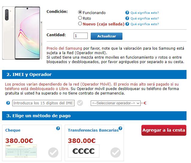 Otra de nuestras paras habituales es Movilbank y en este portal vemos la mejor oferta por nuestro Galaxy Note 10, ya que nos pagan hasta 380 euros por nuestra unidad, siempre que esté en buen estado físico y funcione correctamente.