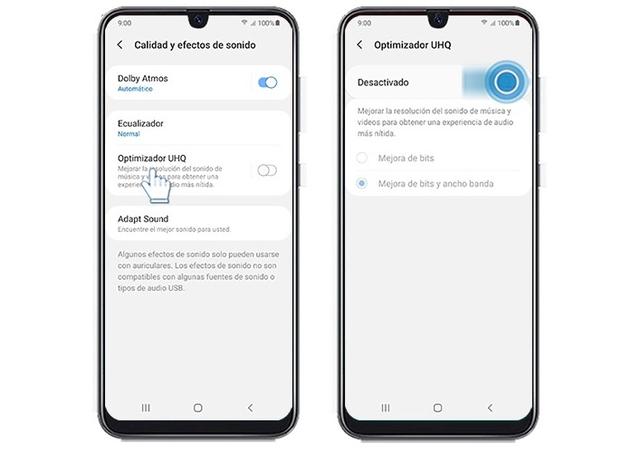 La función UHQ debe activarse de forma manual, ya que no viene activada por defecto en nuestro móvil Samsung. Para hacerlo acudimos a Ajustes/Sonidos y vibración. Después acudimos a “Ajustes de sonido avanzados” y seleccionamos “Calidad y efectos de sonido Samsung”. Ahora solo quedará tocar sobre “Optimizador UHQ” para activar la función y comenzar a notar mejoras en la calidad del sonido.