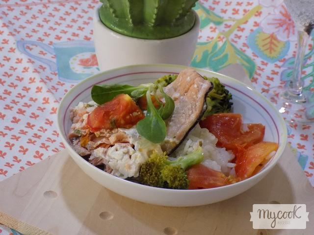 - Coloca al lado del salmón los tomates Cherry y cocina 18 minutos, 120 grados, velocidad 3. Una vez acabado el tiempo, sirve el arroz con el calabacín,el brecol y los tomates y añade a su lado el salmón entero. Está delicioso.