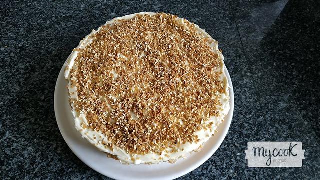 - Ahora montar le tercera y última capa y cubrir con la crema de queso tanto la parte de arriba como los laterales de la tarta.