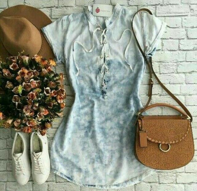 Está acima do peso? Tudo bem usar looks com vestido jeans… Os mais soltos e na altura dos joelhos normalmente são os melhores. Aí, basta acrescentar uma sapatilha, rasteirinha ou salto Anabela. Outra dica é incluir um cinto mais fino, sem apertar muito, só para marcar um pouco a cintura e dar forma.
