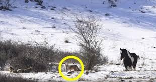 One not so happy horse found himself in the company of wolves during the snow winter day. Video is recorded that he brought a dose of fear to those who are recorded but also for those who watch. It was clear what will follow ...