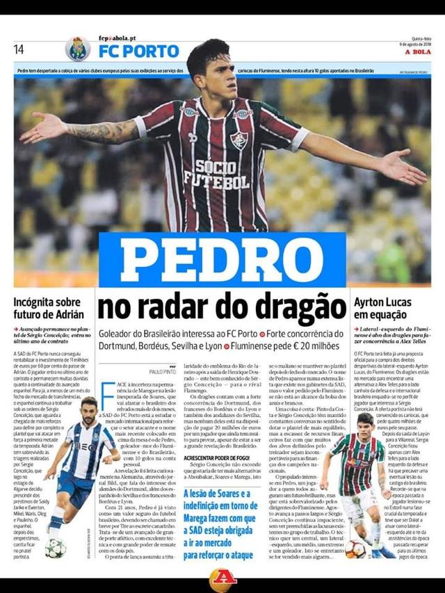 E os interessados não param. Depois de Sevilla (ESP), Atlético de Madrid (ESP), Valência (ESP), Bordeaux (FRA) e, mais recentemente, o Borussia Dortmund (ALE), Pedro, principal destaque do Fluminense na temporada e artilheiro do Campeonato Brasileiro, com dez gols, está na mira do futebol português.
