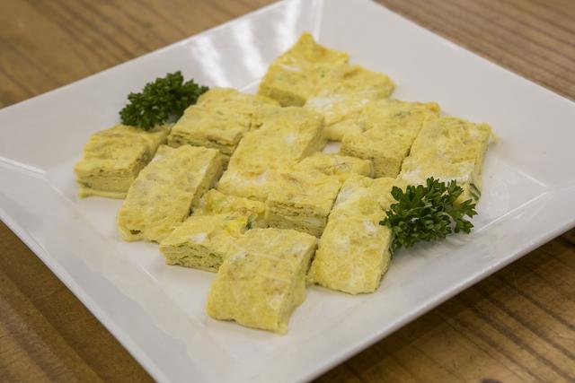 Grease the top of the frying pan, slide the tamago to the other end and grease the bottom of the skillet. Then add a little more of the mixture and add the thin slices of cheese and parsley. Lift the tamago lightly with the spatula or hashi and slide the mixture through the tamago. Let it dry and turn the tamago again, creating new layers. Repeat this process until the mixture is finished. Then place on a plate and cut the tamago in 6 or 8 pieces (it's for whomever you like). Mount on a plate and serve.
