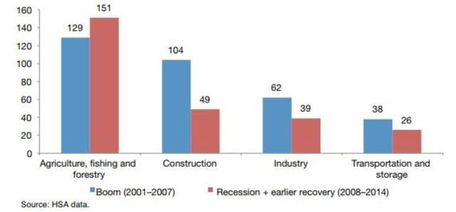 Injury rates in the agriculture, construction and industry sectors fell during the recession (2008-2011) compared to the boom (2001-2007).