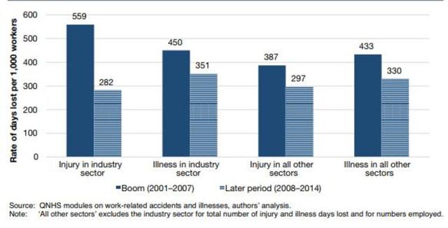 Annual average number of days lost to injury and illness per 1,000 workers in industry, 2001-2014 | Image: ESRI