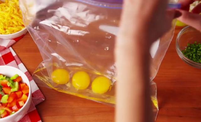 Don’t stop at just ham and other proteins, either. Red and green peppers, shredded cheese, onions, or mushrooms can be tossed into the bag. Whatever you want to go into your omelet, just toss it in now—or forever hold your peace.