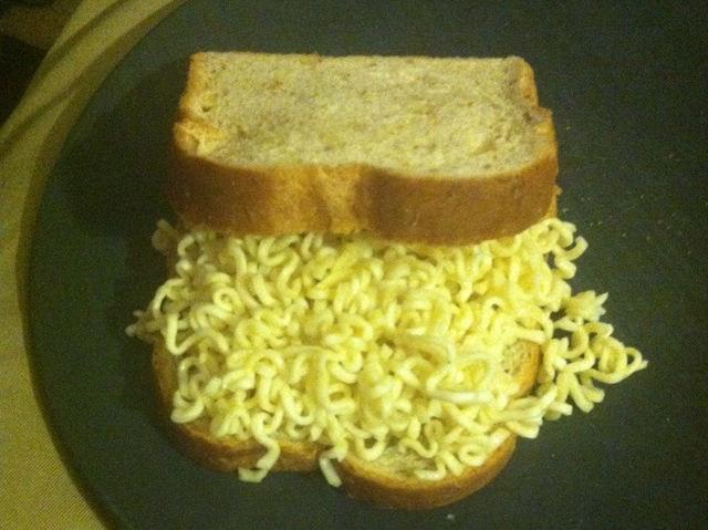 Newsflash: college students get drunk a lot. And, when they get hungry, they work with what they've got (which is a whole lot of cup noodle soup.) This sandwich might not seem appetizing, but wait 'till you see the ramen cheeseburger in #8...