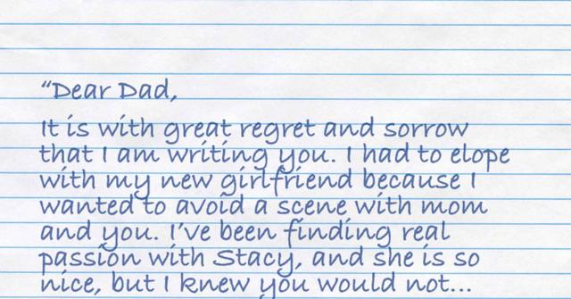 “It is with great regret and sorrow that I am writing you. I had to elope with my new girlfriend because I wanted to avoid a scene with mom and you. I’ve been finding real passion with Stacy, and she is so nice, but I knew you would not approve because of her piercings, tattoos, tight motorcycle clothes, and the fact she’s much older than me. But it’s not only the passion dad. She’s pregnant.