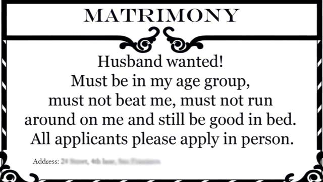 Must be in my age group, must not beat me, must not run around on me and still be good in bed. All applicants please apply in person.
