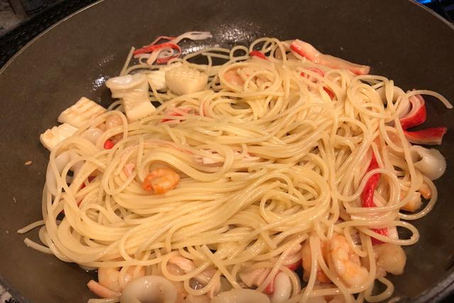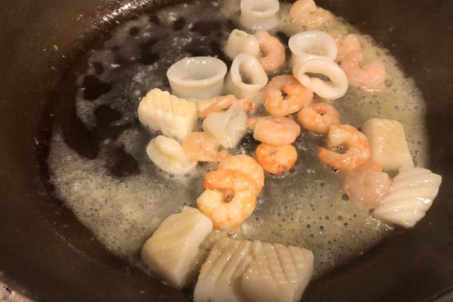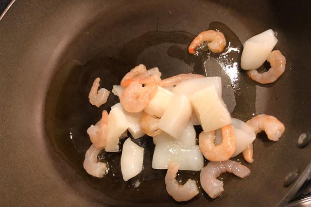 事前に解答しておいたシーフードミックスを、オリーブオイルをひいたフライパンで軽く炒める
