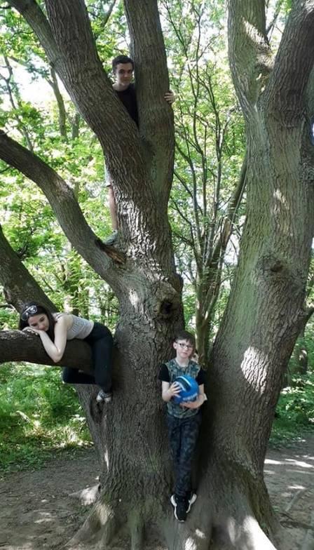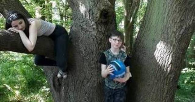 Na imagem, os filhos de Laura, Charlotte Hill, de 15 anos, e Byrin Watson, de 9, posam em uma árvore juntamente com o primo Jack, de 16.