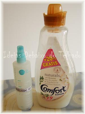 Para cada 200 ml de água junto 1 colher de sopa de amaciador para a roupa. Como o único amaciador que resta cá em casa é concentrado, em vez de uma colher de sopa, tenho substituído por uma colher de chá.