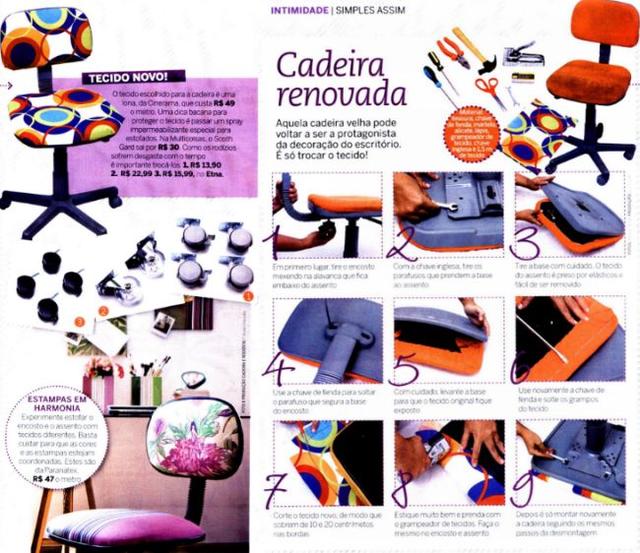 A cadeira de escritório pode ser forrada da mesma maneira que a cadeira anterior, porém pode ser mais fácil, caso o assento e o encosto possuam uma parte de encaixe, pois assim basta encaixar o tecido, não precisa grampear e aplicar a cola.