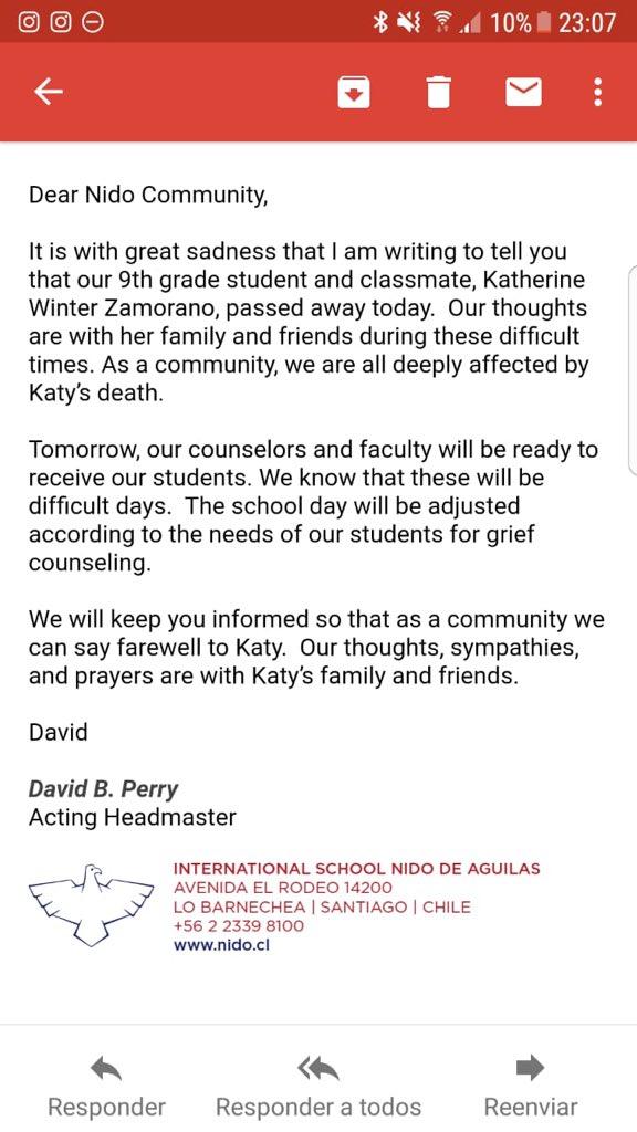 Según varios testimonios, Katy Winter era una niña alegre, resuelta y aspiraba a ser cantante profesional. Sin embargo, su fallecimiento desconcertó a toda la comunidad escolar y amigos. A pocas horas del hallazgo de la joven sin vida, el centro educativo envió un comunicado a los padres y escolares en el cual lamentaron la muerte de "nuestra alumna Katy Winter" y en el que afirmaron estar trabajando en "contener y apoyar a nuestros alumnos en cada una de nuestras sales de clase".